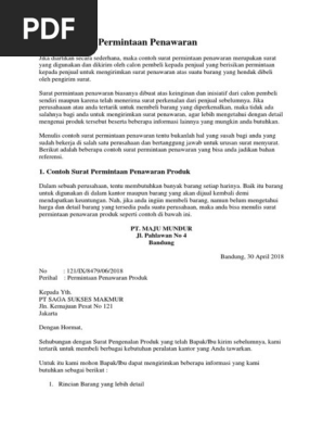 Maksud dan tujuannya adalah untuk meminta informasi lebih rinci/detail mengenai suatu produk atau jasa yang. Sehubungan dengan surat tersebut kami menawarkan. Surat penawaran barang adalah surat bisnis yang dibuat oleh suatu perusahaan dalam rangka menawarkan barang atau jasa yang ditujukan instansi atau perusahaan lain, dan surat ini termasuk kedalam kategori komunikasi bisnis. Contoh surat permintaan penawaran produk dan harga. Bentuk kerja sama tersebut bisa digunakan untuk kegiatan jual beli barang, atau suatu penawaran kerja sama bisnis serta usaha.