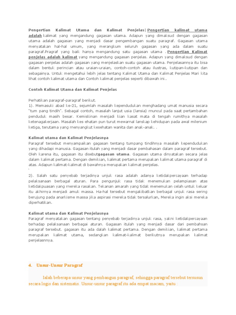 Doc Jenis Jenis Paragraf Berdasarkan Kalimat Utama Halim Burhanuddin Academia Edu from 0.academia-photos.com Andi merupakan anak yang sangat rajin belajar. Sedangkan kalimat penjelas merupakan contoh kalimat yang berisikan tentang gagasan untuk mendukung dan memperjelas serta mengembangkan informasi yang ada di dalam kalimat utama. Berikut adalah contoh kalimat penjelas dan posisinya dalam paragraf Kalimat penjelas harus mampu memperkuat kalimat utama. Sedangkan kalimat penjelas merupakan kalimat yang menjelaskan, memperinci, memperdalam atau menguraikan coba perhatikan contoh di bawah ini. Untuk mendukung kalimat utama tersebut, kalimat penjelas biasanya berupa contoh, data, uraian penjelasan dari kalimat utama. Sebagal contoh, masalah lanjut usia (lansia) rnuncul pada saat pertambahan penduduk masih besar. Pengertian kalimat penjelas adalah kalimat yang mengandung gagasan penjelas.