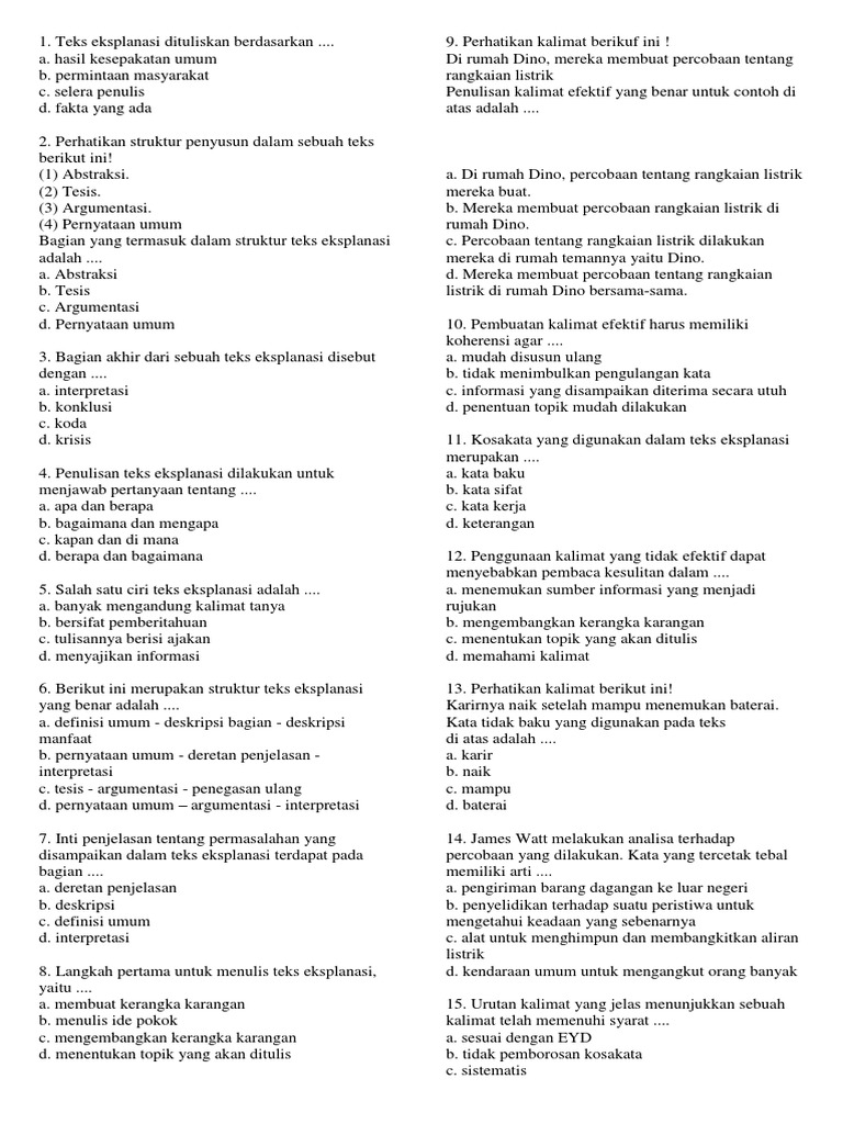 2 from Pertanyaan adalah ekspresi keingintahuan yang perhatikan kutipan paragraf di atas. Temukan informasi penting dari teks eksplanasi tersebut sesuai dengan urutan paragrafnya! Perhatikan pengunaan kosakata baku dan kalimat efektif. Kalimat efektif adalah kalimat yang dapat menyampaikan gagasan kepada pembaca sesuai dengan apa yang ingin disampaikan oleh penulis dengan cara yang efisien dan tersusun berdasarkan kaidah dan struktur bahasa indonesia yang baik dan baku. Sebuah kalimat dikatakan baku jika kalimat tersebut logis ataupun dapat diterima dalam akal sehat pembaca dan pendengarnya. Ada baiknya juga mengetahui bagaimana cara menulis kalimat yang efektif, penulisan huruf kapital, penggunaan tanda baca yang benar dan penulisan kalimat baku yang sesuai dengan struktur atau. Perhatikan penggunaan kalimat efektif pada kalimat yang kamu buat. Contoh penggunaan kosakata tidak baku dan kalimat tidak efektif pada suatu tulisan yaitu.